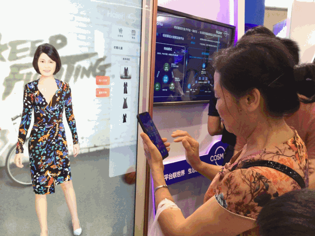 早在智博會開始之前,AR試衣就已刷遍朋友圈:隔空操作,智能識別各種身材,自動調(diào)節(jié)服裝大小,一秒試衣。