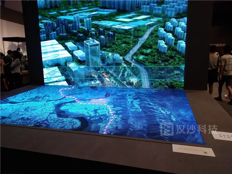 僅僅兩面的投影就展示了城市的全部地貌和信息,立體逼真的畫面,時時變換的效果,讓人驚嘆不已。